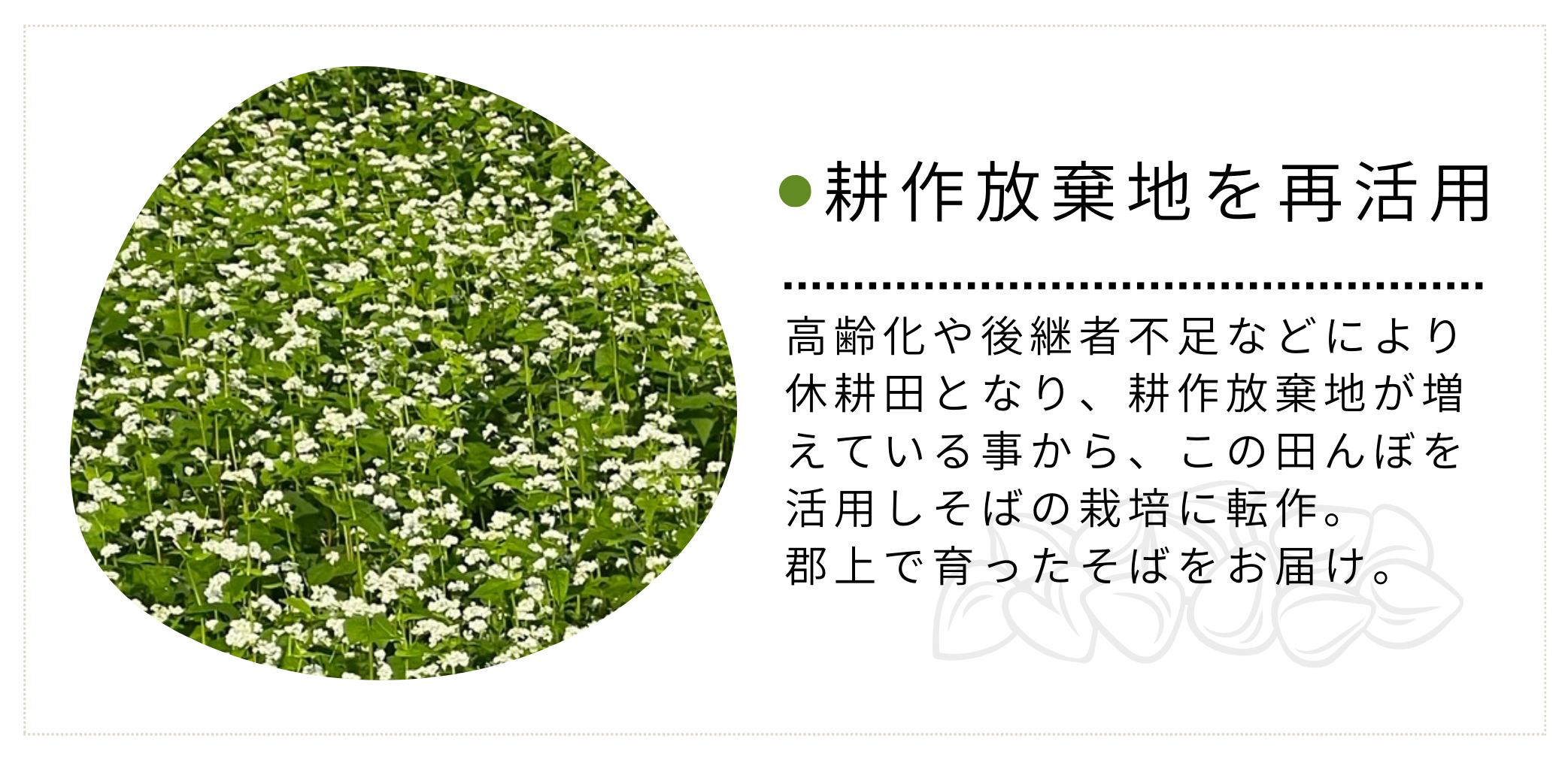 耕作放棄地が増えている事から、休耕田となった田んぼをそばの栽培に活用しています。
