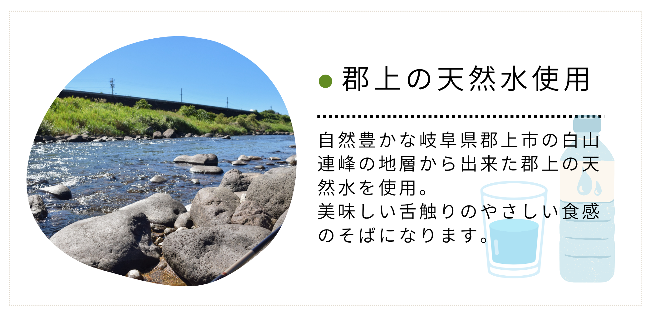 自然豊かな岐阜県郡上市の白山連峰の地層から出来た郡上の天然水を利用し、製粉・製麺・商品化(生・乾燥・冷凍など)・梱包まですべて自社で製造しています。